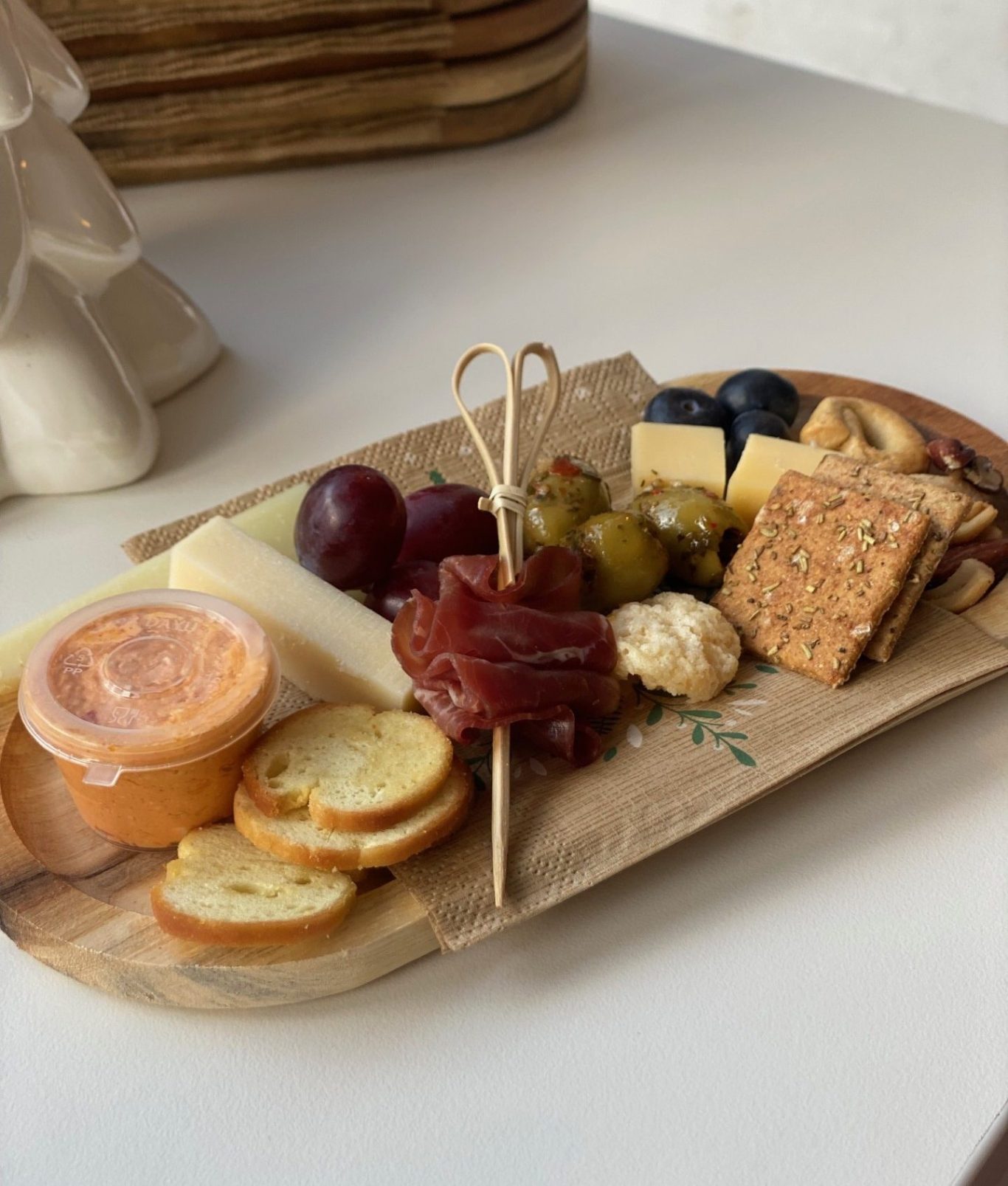 Jeder Gast bekommt ein liebevoll zusammengestelltes Brettchen. Viele verschiedene Komponenten sind enthalten. Der Star ist der Käse und ergänzt wird er durch einen Dipp, Obst, Cracker und Antipasti. Selbstverständlich kann alles an eure Wünsche angepasst werden.